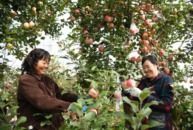 10月17日,果农在延安市宝塔区桥沟街道烟洞沟村采收苹果。新华社记者 张博文 摄