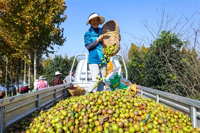 10月28日,光山县凉亭乡王湾村新天地合作社油茶种植基地,农民正在把采摘的油茶果装车。近年来,当地坚持“企业+基地+农户”的发展模式,把油茶产业作为富民特色产业,推广新技术,发展深加工。谢万柏 摄